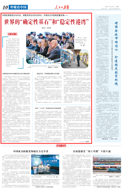 近日,随着中国发展高层论坛2026年年会、博鳌亚洲论坛2026年年会相继举行,国际舆论再度聚焦中国。“中国发展的确定性”“扩大高水平对外开放”“全面优化营商环境”“构建开放包容的区域合作框架”等成为热议的话题。多家外媒指出,今年是“十五五”开局之年,中国释放的积极信号,不仅向全球商界传递了稳定预期,也为充满不确定性的世界经济注入了宝贵信心。