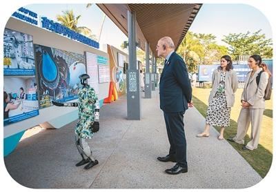 博鳌亚洲论坛2026年年会期间,机器人讲解员向外宾介绍海南。