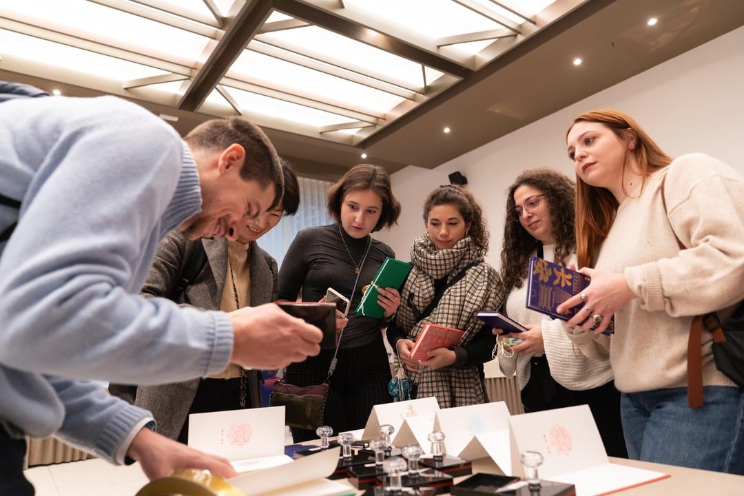图为在“丝路长安·对话欧洲”城市文化交流活动启动仪式暨西安城市推介会上,来宾们体验中国文创。主办供图