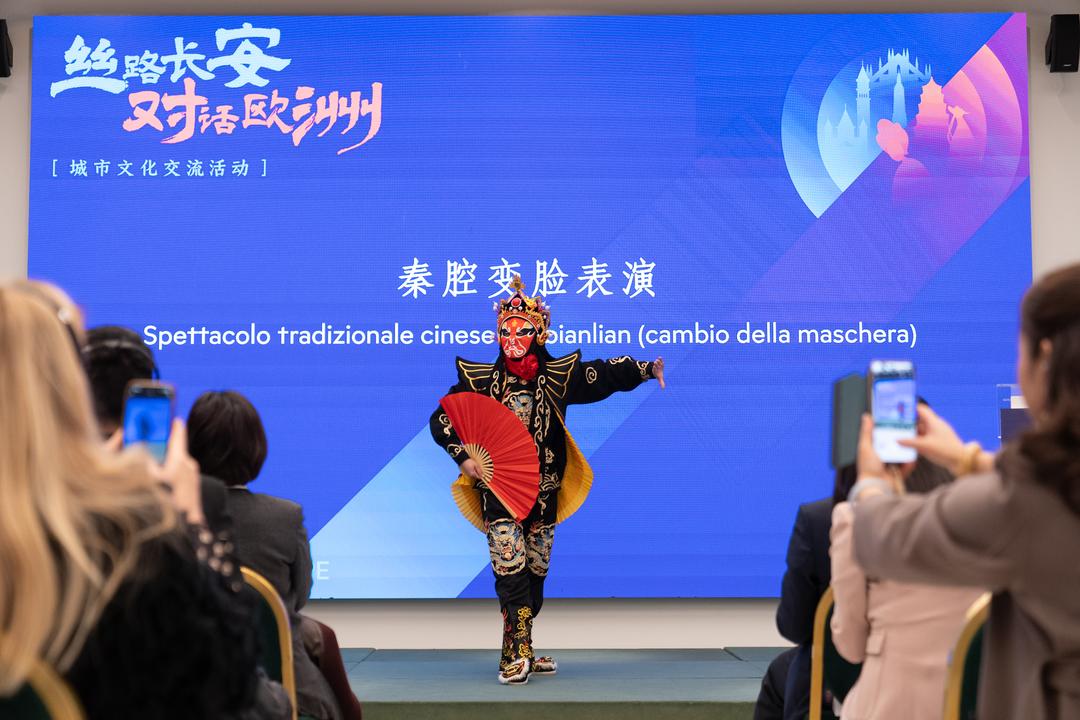 图为在“丝路长安·对话欧洲”城市文化交流活动启动仪式暨西安城市推介会上,演员在表演秦腔变脸。主办方供图