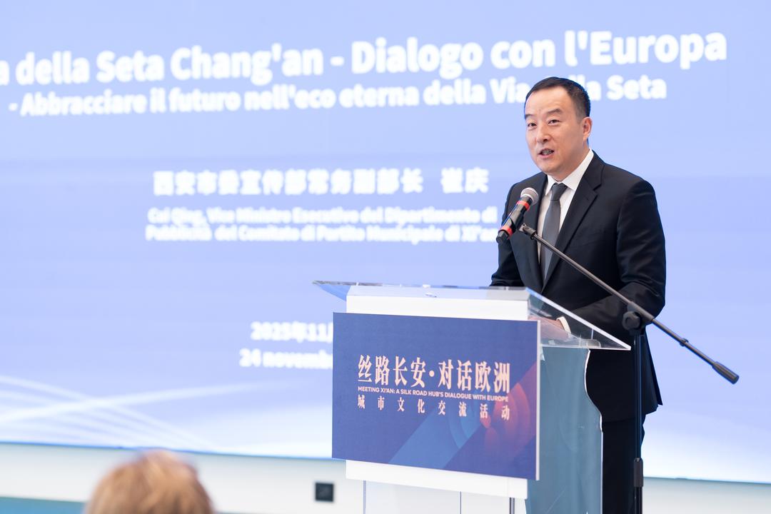 图为西安市委宣传部常务副部长崔庆在“丝路长安·对话欧洲”城市文化交流活动启动仪式暨西安城市推介会上致辞。主办方供图