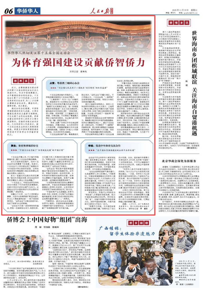 从珠江之畔到五洲四海,第十五届全运会不仅是一场体育盛会,更是一次全球华侨华人的情感团聚与力量凝聚。区域协同与国家发展的同频、侨心侨力与体育强国的共振,汇聚起跨越山海的磅礴力量。(本报记者 贾平凡)