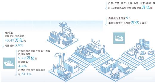 2025年,我国货物贸易进出口总值达45.47万亿元,同比增长3.8%,继续保持全球货物贸易第一大国地位。各省份充分发挥区位优势,立足资源禀赋,积极为我国进出口稳步发展作出贡献。外贸“成绩单”,彰显出中国经济的韧性与活力。