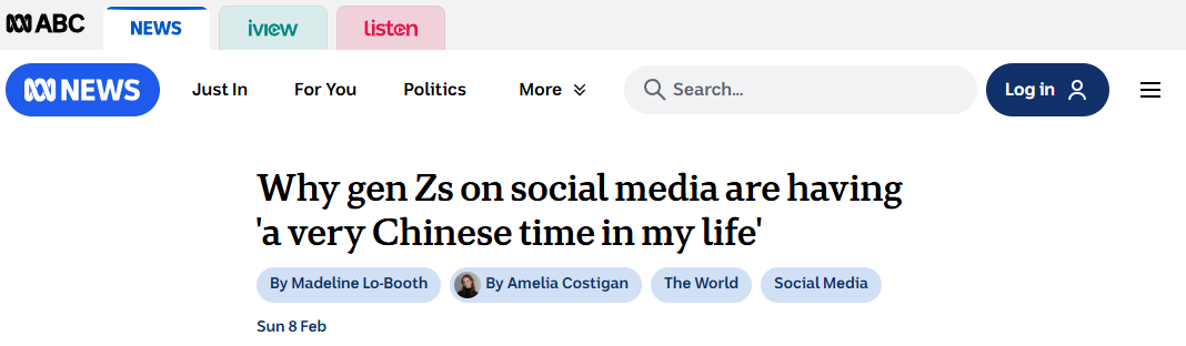 澳大利亚广播公司2月8日发表题为《为何Z世代在社交媒体上开启“我的人生很中国”时刻?》