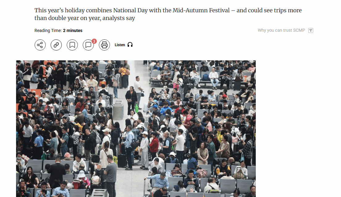 《南华早报》的报道称,在本周开始的超长假期期间,一些免签政策和中国国内高速免费预计将推动出游人数激增,这对服务业经济是一个利好。报道还指出,今年的假期将国庆和中秋节结合在一起,旅游人数可能会比去年增加一倍以上。