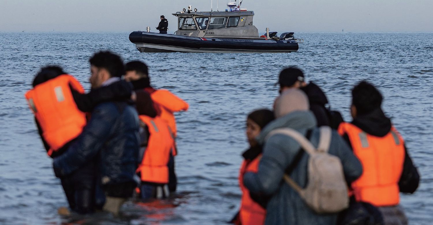 3月3日,在法国北部敦刻尔克附近海域,一群非法移民携家带口试图登上准备横穿海峡前往英国的偷渡船,法国海上宪兵队巡逻艇在附近监视。法新社图