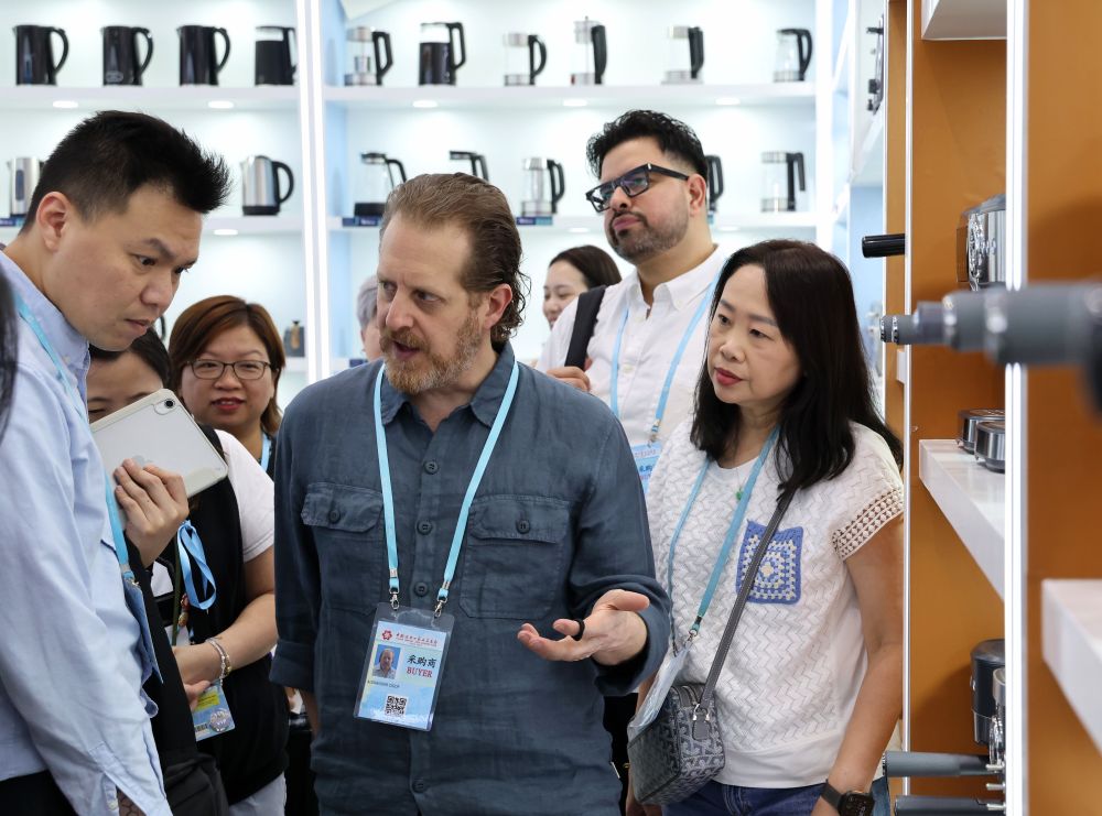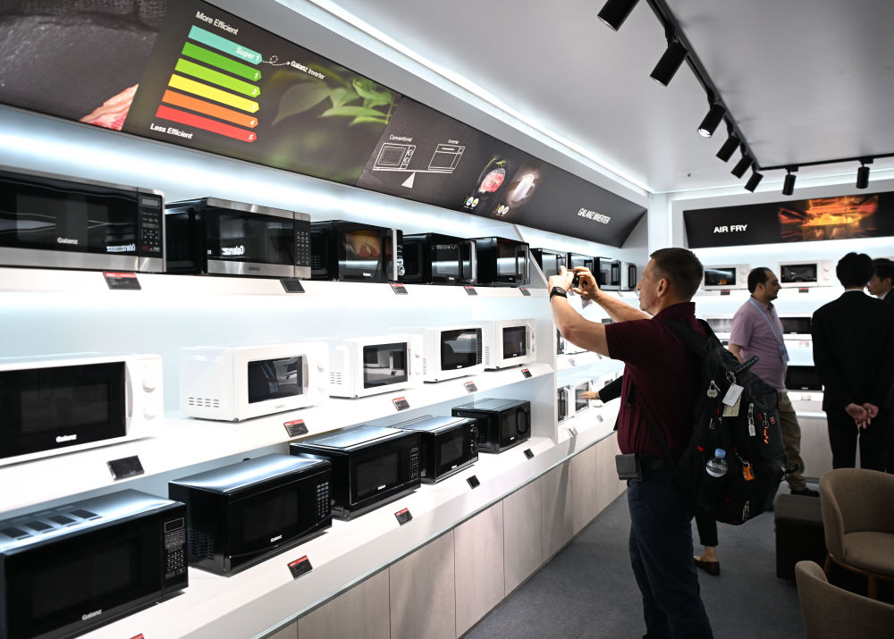 4月15日,在第137届广交会的智慧生活专区,境外采购商参观格兰仕家电产品。新华社记者 邓华 摄
