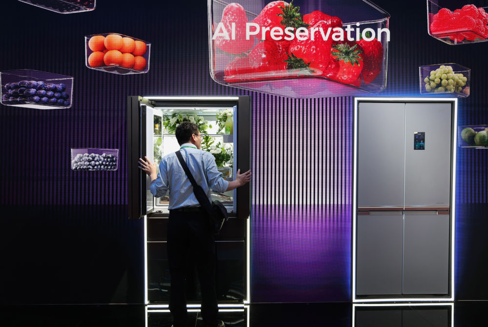 4月16日,客商在广交会上参观了解一款智能冰箱。新华社记者 卢汉欣 摄
