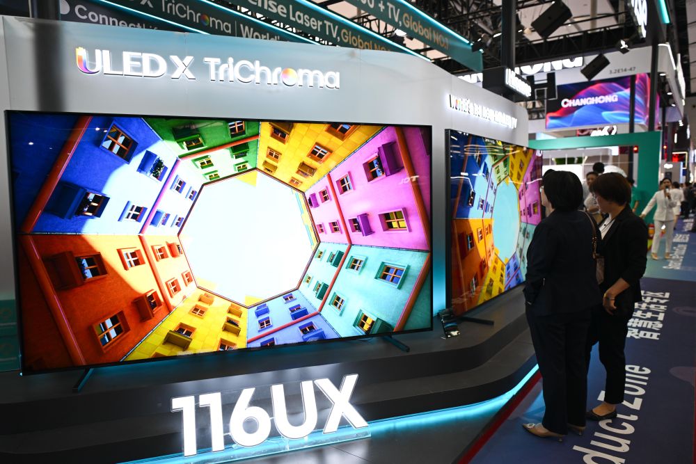 4月16日,在第137届广交会的智慧生活专区,观众观看大尺寸电视产品。新华社记者 邓华 摄