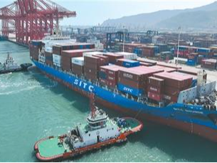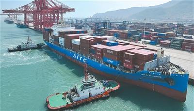 不久前,江苏省连云港一处集装箱码头,一艘满载集装箱的货轮缓缓驶进泊位。