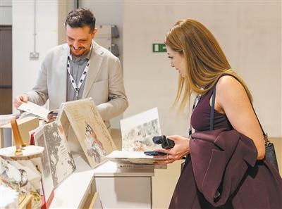 两名参展商在中国联合展台翻阅《红楼梦》画册。