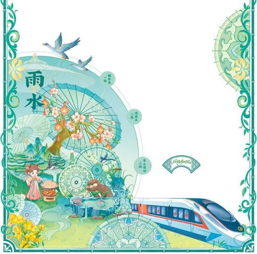 “好雨知时节”“春雨贵如油”。雨水节气后降水逐渐增多,伞作为避雨的工具,是人们外出远行必备之物。我国伞制作技艺历史悠久,伞面艺术创作表现形式丰富,甲路纸伞、分水油纸伞、西湖绸伞等被列入国家级非遗名录。