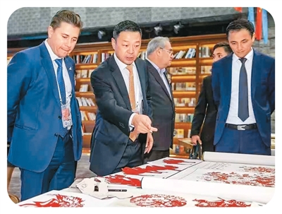 何诚(左二)向哈萨克斯坦友人介绍中国剪纸。