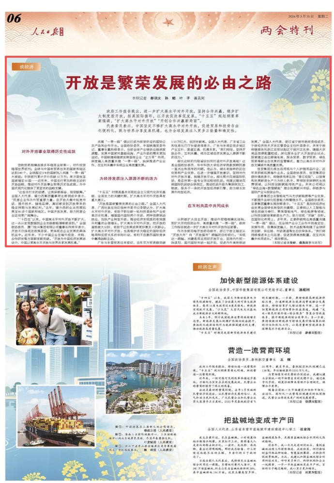 “‘十四五’以来,中国高水平对外开放不断扩大,这一点从宏观数据到企业实践都能清晰感受到。”全国政协委员、厦门恒兴集团有限公司董事长柯希平表示,开放不仅体现在政策层面,更体现在企业发展的具体机会中。近年来,不少中国企业在海外投资、并购、合作研发等方面都有新突破。“开放为中国经济发展添动力,中国以更高水平开放与世界共享发展机遇。”