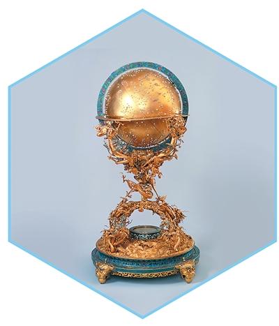 乾隆年间造办处所制的金嵌珍珠天球仪是一件华美绝伦的艺术珍品。天球表面镶嵌了数千颗珍珠,代表天上的繁星。天空中肉眼可见越亮的星,镶嵌的珍珠越大。九龙环绕的纯金支架支撑着球体,下置四兽足基座,座上有东、南、西、北四字,并在座心安装了罗盘。天球仪内部还有机械装置,转动钥匙后可以演示天象运行。此器是流传至今唯一以黄金制成的天球仪模型,其礼制意义大于实用功能。