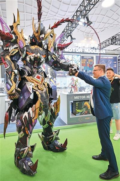 第六届中国国际消费品博览会上,一名外国参观者与中国风机甲人偶互动。