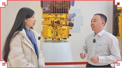 人民日报吉林分社记者刘以晴(左)在采访青年卫星设计师。