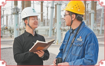人民日报甘肃分社记者宋朝军(左)在曲子变电站采访运维专家。
