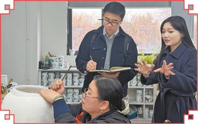 人民日报湖南分社记者杨迅(后左)在采访陶瓷制作。