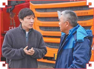 人民日报浙江分社记者窦瀚洋(左)在采访卡车司机。