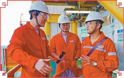 人民日报地方部记者宋飞(左)、海南分社记者董泽扬(中)在深海一号采访。