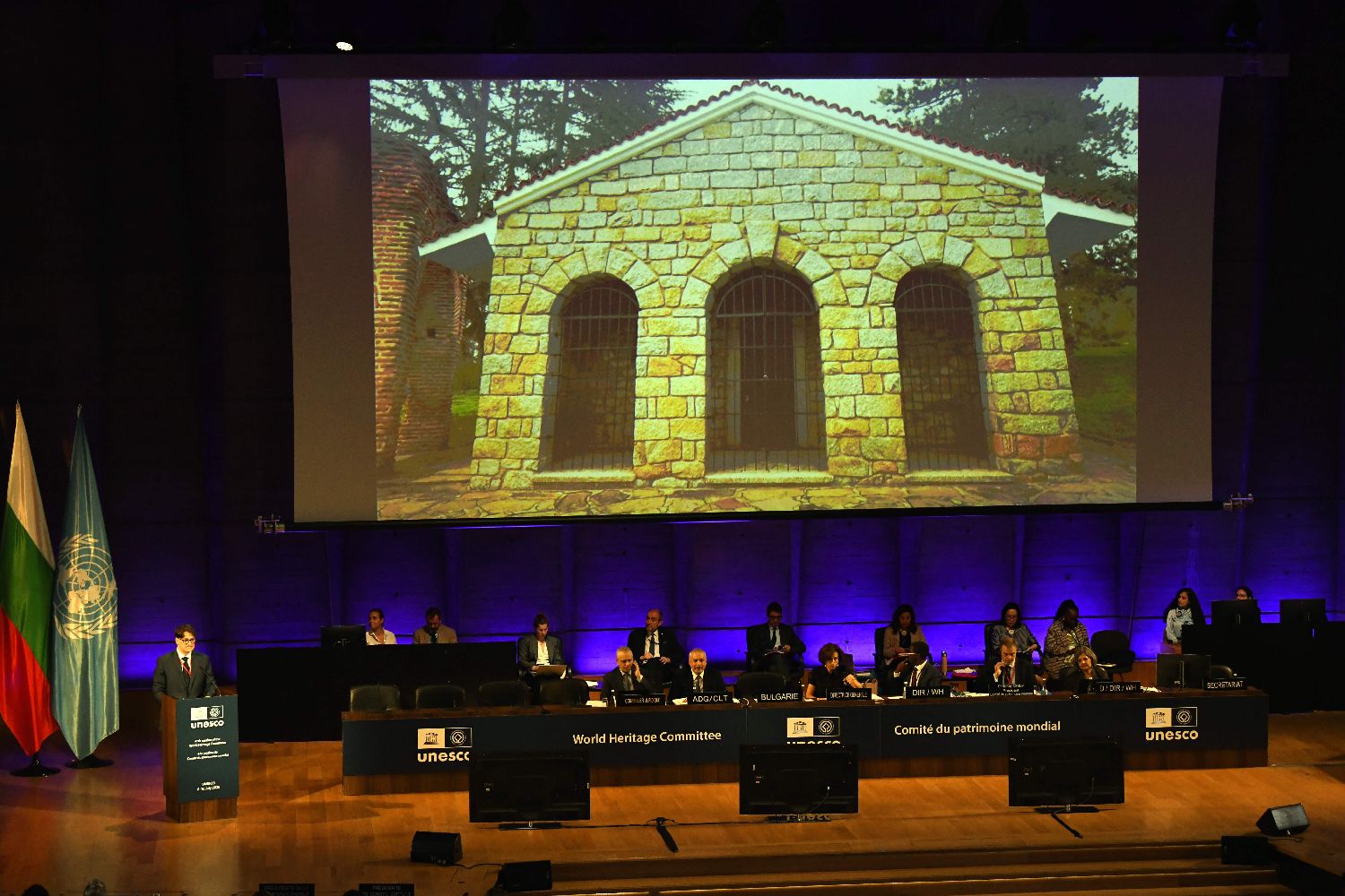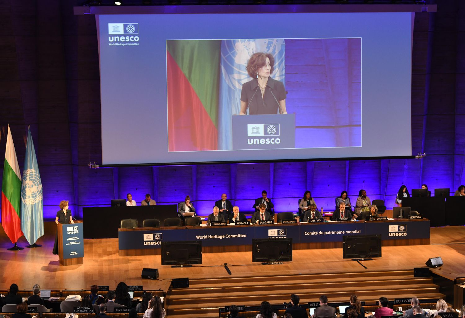 7月7日,第47届世界遗产大会在位于法国巴黎的联合国教科文组织总部开幕。 本届世界遗产大会主席国是保加利亚。图为保加利亚...