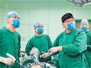 图为李明(右二)为直肠癌患者实施腹腔镜微创根治手术。