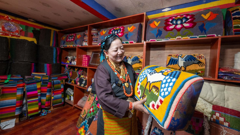 3月25日,西藏日喀则市岗巴县直克乡乃村顺心合作社负责人德吉在介绍藏式靠枕。新华网 旦增努布 摄