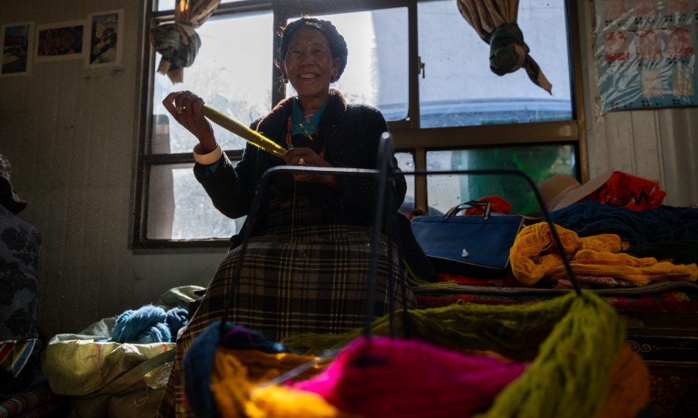 3月25日,西藏日喀则市岗巴县直克乡乃村顺心合作社员工在捻线。新华网 旦增努布 摄