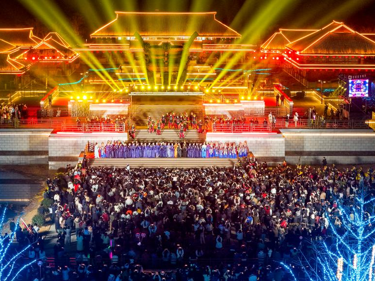 荆州纪南生态文化旅游区中,“荆州十二时辰·楚乐八百年”大型展演再现2000多年前楚国郢都“车毂击,民肩摩”的盛景,让楚文化不再只是典籍中的文字,而是可触可感的艺术呈现,给观众留下历久弥新的荆楚文化印记;