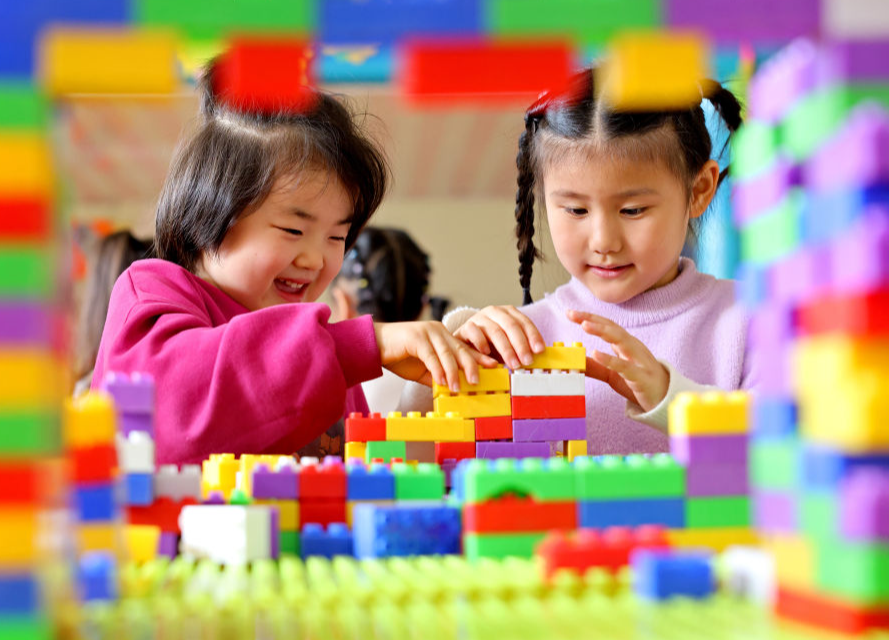 2025年11月6日,在山东省枣庄市市中区西王庄镇中心幼儿园,托育班的小朋友在拼搭积木。新华社发(孙中喆 摄)
