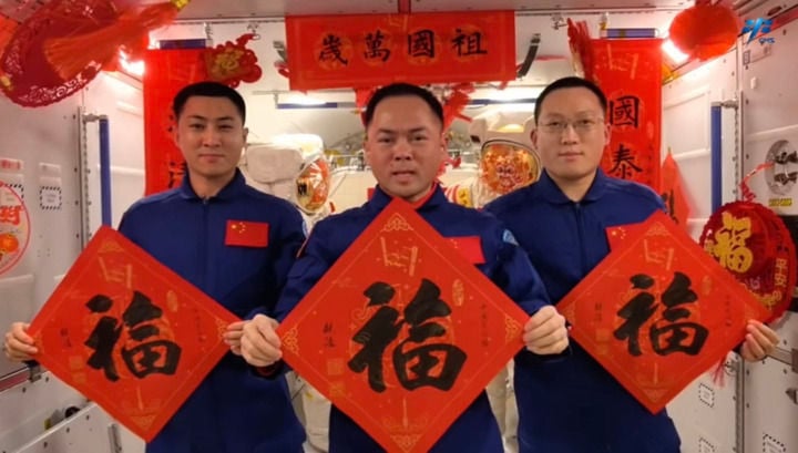 春节前夕,神舟二十一号航天员乘组在中国空间站向全国人民拜年(视频截图)。新华社发