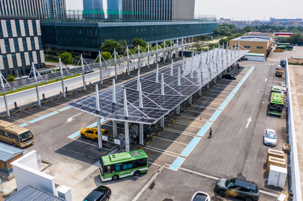 2025年5月27日拍摄的浙江省湖州市长兴公交总站光储充一体化公交充电站(无人机照片)。新华社记者 徐昱 摄