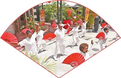 中塞民众在塞舌尔首都维多利亚练习太极扇。