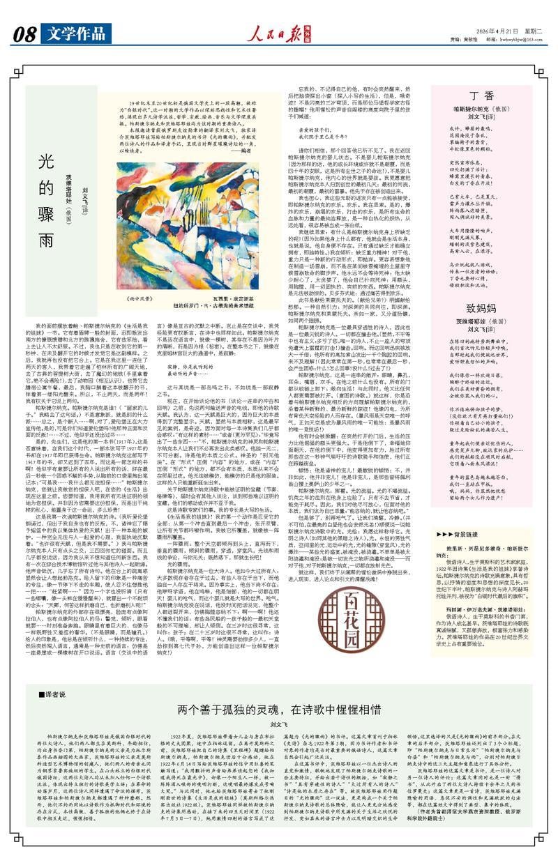 本报邀请曾获俄罗斯友谊勋章的翻译家刘文飞,独家译介茨维塔耶娃写给帕斯捷尔纳克的书评《光的骤雨》,并配发两位诗人的作品和译者手记,呈现当时群星璀璨诗坛的一角,以飨读者。