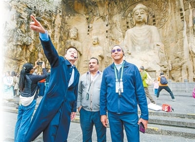 出席第六届世界古都论坛的外国嘉宾在龙门石窟参观。