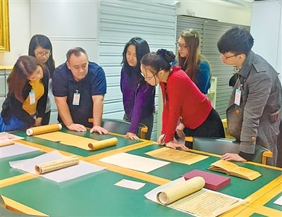 高奕睿(左三)与学生在大英图书馆研究敦煌文献。