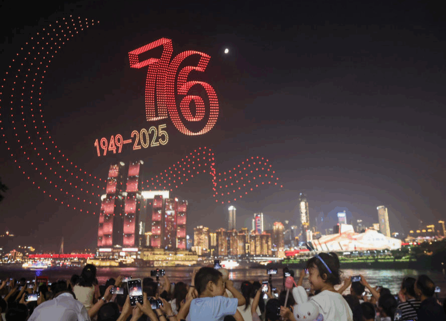 科技与文旅的融合,也为假日夜间消费增添别样色彩。10月1日晚,以“家国共庆”为主旋律的大型无人机灯光秀在重庆长江和嘉陵江上空上演。数千架无人机以天为幕,用璀璨的光影画卷为游客呈现了一场兼具科技感与人文温度的视觉盛宴。