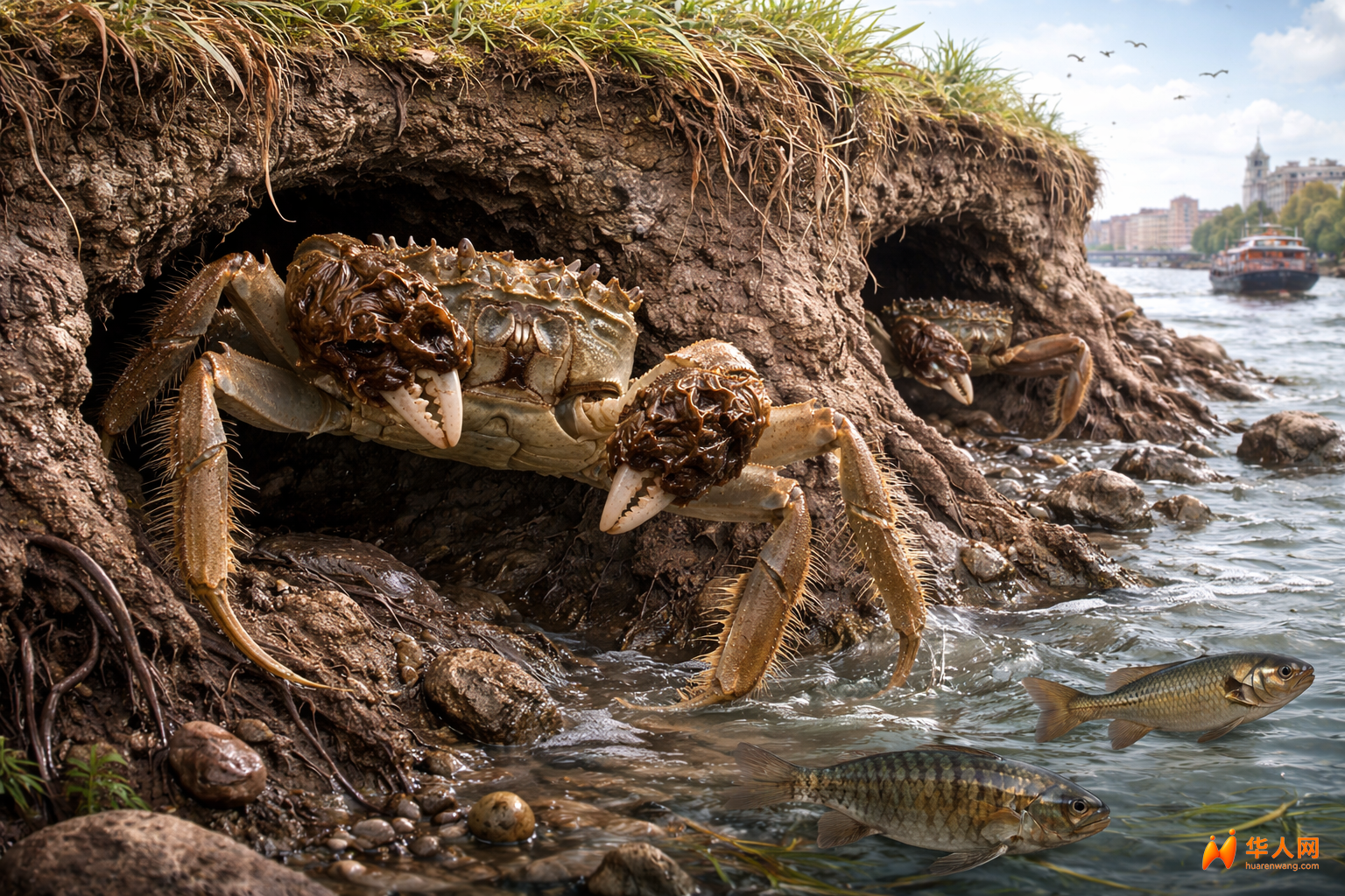 更大的隐患其实发生在看不见的地方。中华绒螯蟹喜欢在河岸内部打洞,用来躲避天敌和潮汐变化。在数量密集的区域,一平方米内甚至能挖出几十个洞。这些洞会慢慢掏空河岸结构,导致堤坝变得松散,一旦遇到水流冲击,很容易发生塌陷,甚至增加洪水风险。