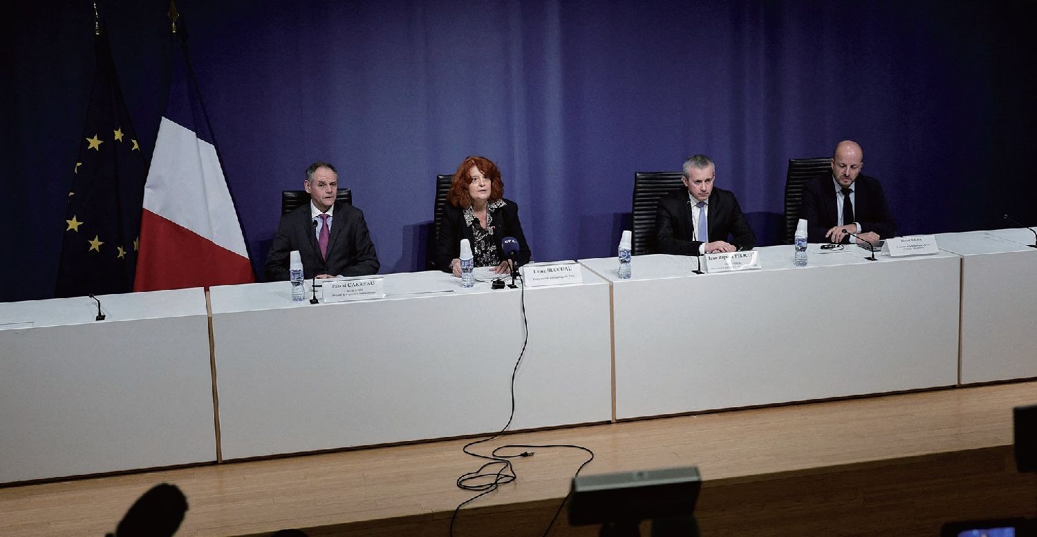 图为贝库欧(左二)和检警部门负责人30日出席新闻发布会。法新社图