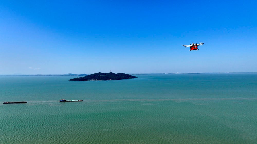 在安徽省合肥市巢湖上空,无人机在配送快递包裹(无人机照片,2025年8月19日摄)。新华社记者 黄博涵 摄