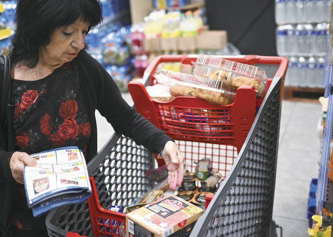 今年8月法国家庭信心指数再度下滑,跌至2023年10月通胀高企时水平。图为马赛超市内,顾客手持促销广告,精打细算挑选商品。法新社图