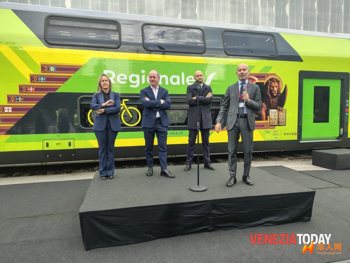 在威尼斯Marghera的列车维护基地举行的新列车发布会上,威尼托大区主席卢卡·扎亚(Luca Zaia)、副主席埃莉萨·德·贝尔蒂(Elisa De Berti)、Trenitalia首席执行官詹皮耶罗·斯特里修利奥(Gianpiero Strisciuglio)以及区域运营主管玛丽亚·安努齐亚塔·贾科尼亚(Maria Annunziata Giaconia)共同出席。