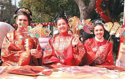 外国游客在浙江舟山马岙文廊集市体验鱼灯制作。