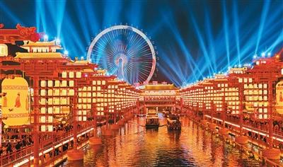 河北唐山河头老街景区内灯光璀璨,吸引众多游客前来游览。