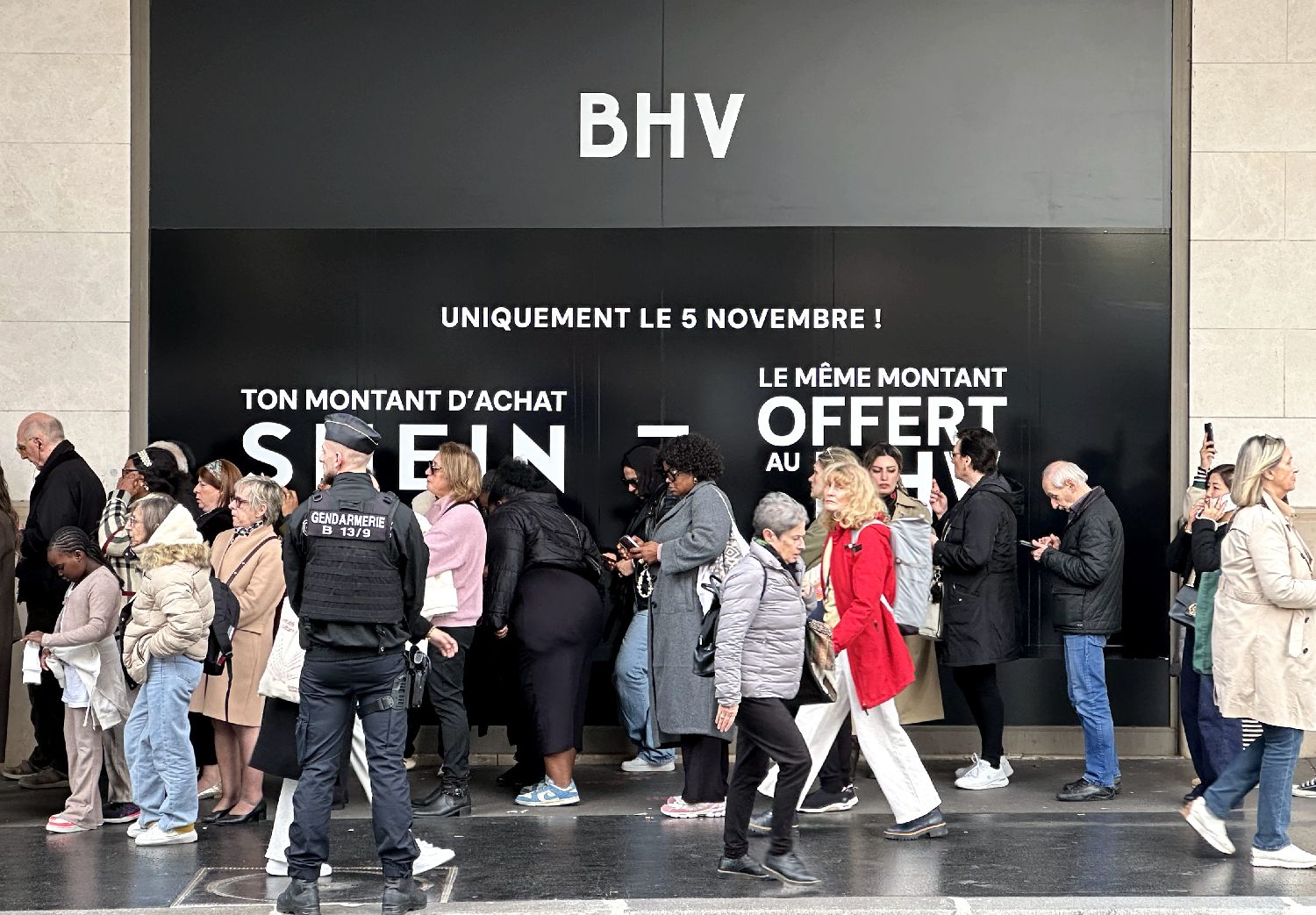 中新社报道,希音的全球首家实体店开设在位于巴黎市中心的百货商场BHV内的六楼,占地1000平方米。大批民众当天在店外排队入场,BHV工作人员向排队民众发放入场券,秩序保持正常。