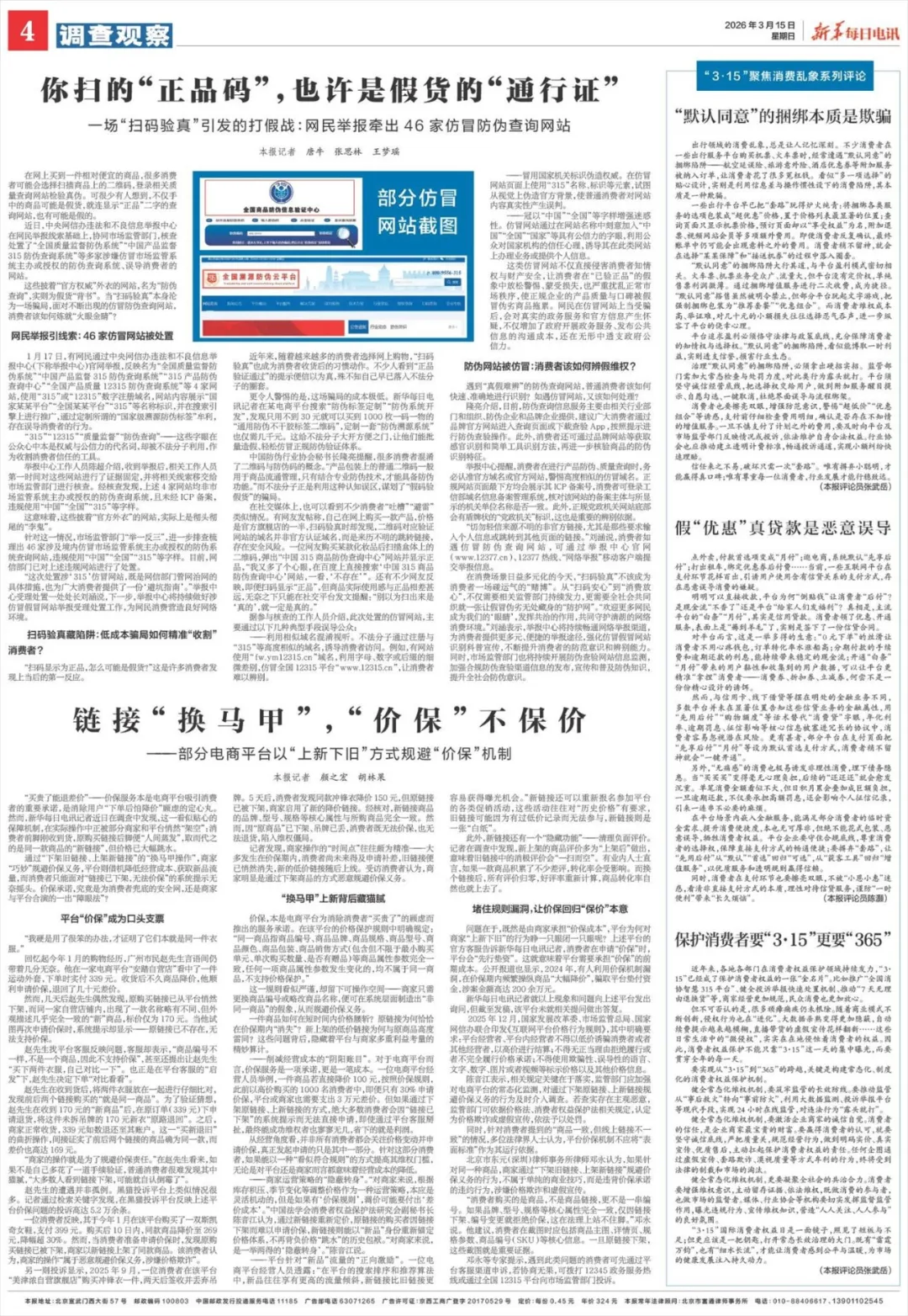 在消费场景日益多元化的今天,“扫码验真”不该成为消费者一场碰运气的“赌博”。从“扫码安心”到“消费放心”,不仅需要相关监管部门持续发力,更需要全社会共同织就一张让假冒伪劣无处藏身的“防护网”。“欢迎更多网民成为我们的‘眼睛’,发挥共治的作用,共同守护清朗的网络消费环境。”刘涵表示,举报中心将持续畅通网络举报渠道,为消费者提供更多元、便捷的举报途径,强化仿冒假冒网站识别科普宣传,不断提升消费者的防范意识和辨别能力。同时,市场监管部门也将持续开展防伪查验网站信息监测,加强合规防伪查验渠道信息的发布,宣传和普及防伪知识,提升全社会防伪意识。(记者唐牛 张思林 王梦瑶)