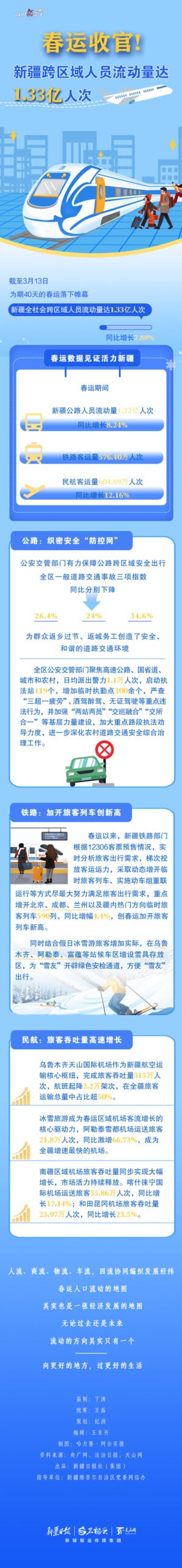 人民日报海外版 数说“新”变化丨春运收官! 新疆跨区域人员流动量达1.33亿人次 截至3月13日,为期40天的春运落下帷幕,新疆全社会跨区域人员流动量达1.33亿人次,同比增长7.88%。 意大利华人网 4 小时 之前 截至3月13日,为期40天的春运落下帷幕,新疆全社会跨区域人员流动量达1.33亿人次,同比增长7.88%。新疆是如何保障高水平安全、高效率畅通的交通环境?各部门做了哪些努力?今天的《数说“新”变化》一起来看看。 声明:转载此文是出于传递更多信息之目的。若有来源标注错误或侵犯了您的合法权益,请作者持权属证明与本网联系,我们将及时更正、删除,谢谢 – 推广 –