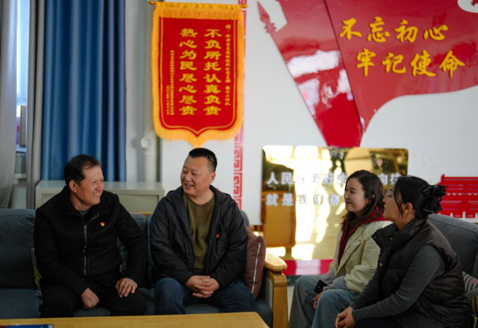 2026年2月9日,在新疆伊犁哈萨克自治州新源县,全国人大代表木沙江·海拉特(左一)在克热格塔斯村党群服务中心与当地第一书记刘华兵(左二),干部居丽迪孜·阿依塔恩(右二)、阿依江·巴合提江交流。 新华社记者 辛悦卫 摄