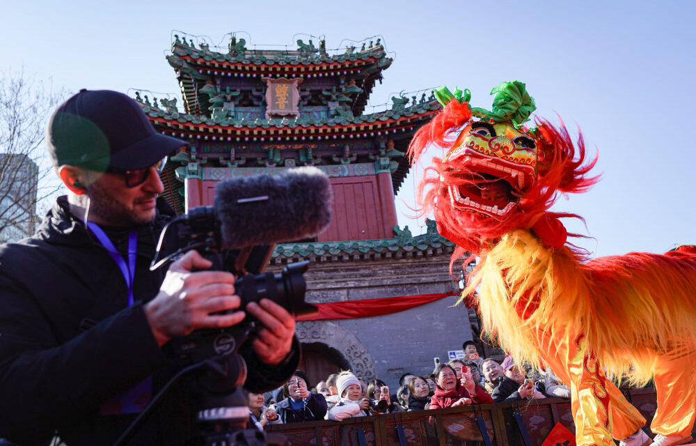 2月17日,东岳庙庙会中的狮舞演出吸引了外国摄影师拍摄。新华社记者 陈钟昊 摄